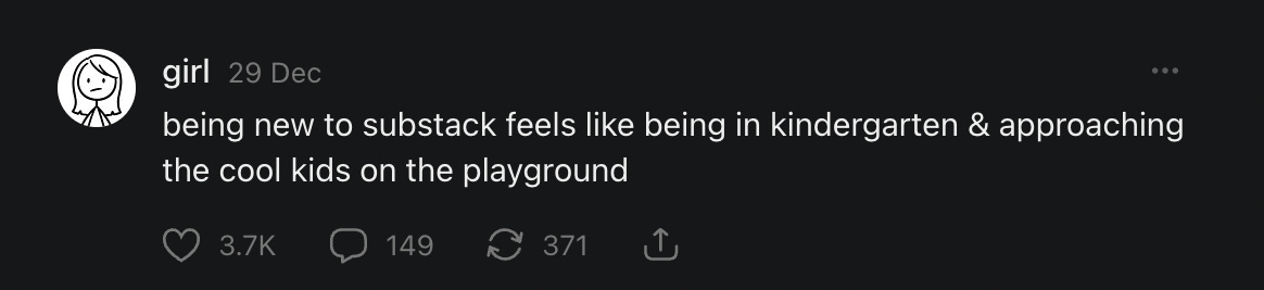 I get that the point of Notes is to give smaller writers a chance to be discovered. This platform makes it hard to connect with new readers other than the ones who already know you, because of Substack’s model as a software-as-a-service (SaaS). SaaS tools allow creators to own their audience data instead of renting it from the tech stack, but this means the readership isn’t built into the platform itself. Writing on a marketplace like Medium, in contrast, relies on the platform’s existing customer base and takes the pressure of audience recruitment off the writer. But let’s say that a grassroots writer gets big on the Substack FYP through Notes—even in this case, I doubt users on the receiving end will actually linger on the author’s profile and explore it properly. Chances are, they’ll just doomscroll to the next Note.